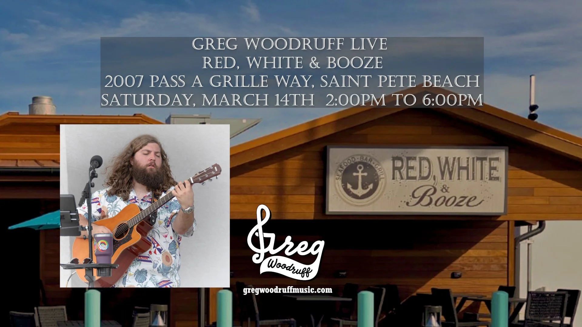 Inspired by brilliant musical artists such as Stevie Ray Vaughan, Jimi Hendrix, James Taylor, the Beatles and more, Greg Woodruff is a local Gulfport, Florida singer, songwriter and guitarist. Often referred to as "an old soul", Greg's mix of folk, classic rock, blues and moving originals offer something for everyone. Whether he is playing at a local restaurant, brewery or area festival, whether he is strumming a six string or jamming on a 12 string, this young man, with a big beard, big heart, and an old soul, will draw you in and you'll be tapping your toes, singing along or even busting some moves throughout his performance. Come see him live and enjoy the show.